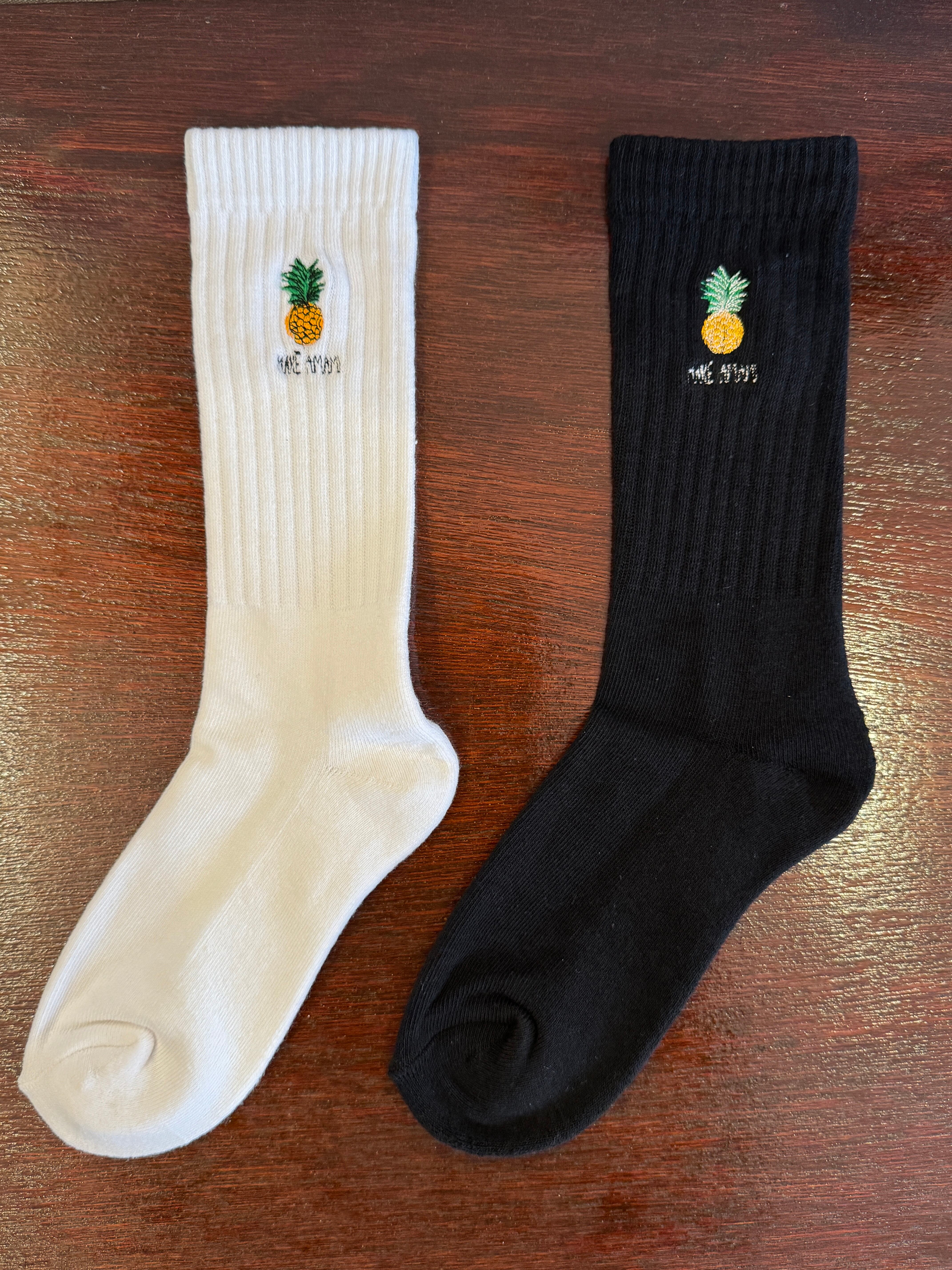 トルトゥーガのオリジナルデザインTシャツで人気のパイナップルロゴを刺繍で入れたソックスです。 普段使いしやすいワンポイントデザインになっています。 お土産やプレゼントにどうぞ!